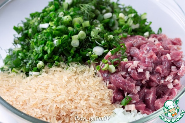 4. Выкладываем в чашку мясо, рис, лук, зелень.