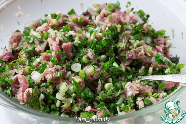 Итак, для начала промываю и мелко нарезаю зелень. Кинза у меня была замороженная, найти свежую не удалось, ее тоже мелко порубила.