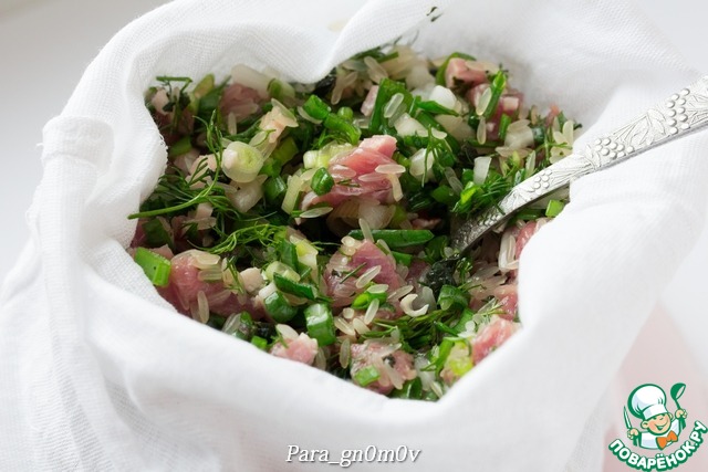 6. Выкладываем получившийся фарш в специально сшитый для этого мешок. Такой мешок имеется в каждой уважающей себя бухарской еврейской семье. Шьется он из плотной льняной или хлопковой ткани. Завязываем мешок так, чтобы оставалось около 10% свободного места для разбухшего в процессе приготовления риса.