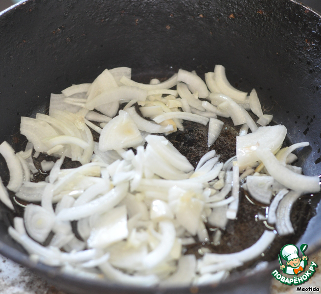 В разогретую сковородку наливаем немного масла, выкладываем лук - слегка обжариваем, до прозрачности,