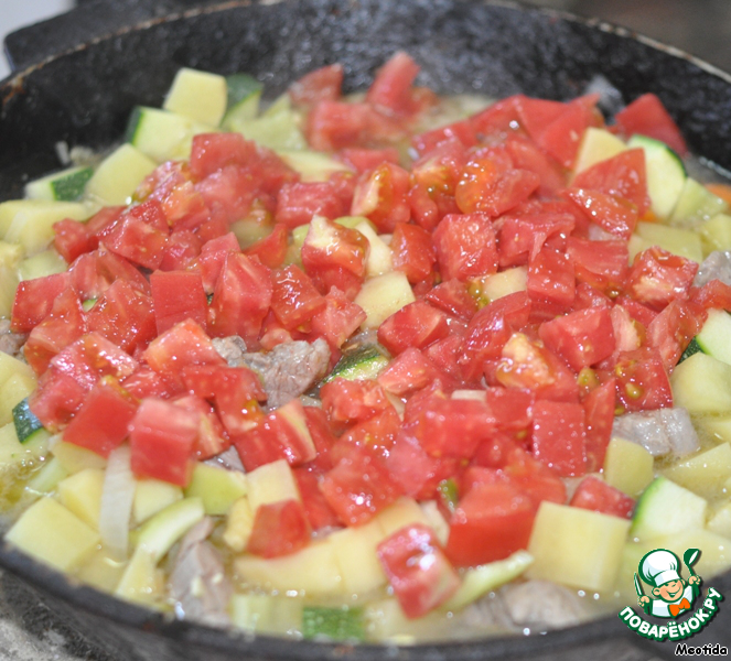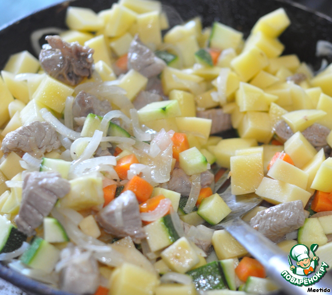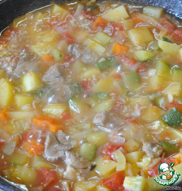 морковь, картофель, мясо, перец, цукини, помидор и грибы.