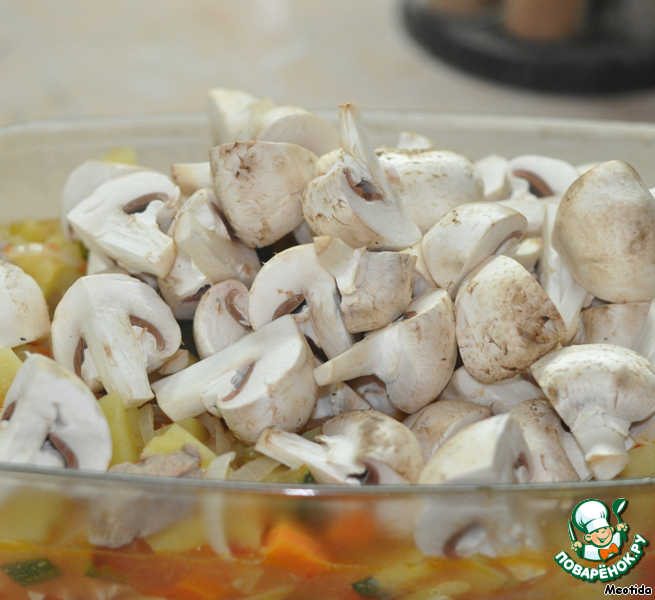 Выкладываем все в глубокую жаропрочную форму, добавляем кусочки шампиньонов, перемешиваем.