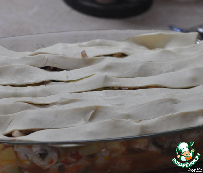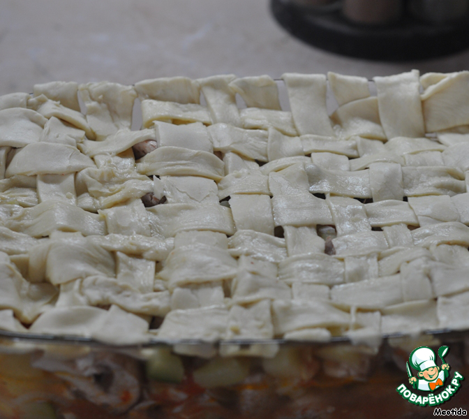 и переплетаем по вертикали, чтобы получилась решетка, смазываем яйцом,