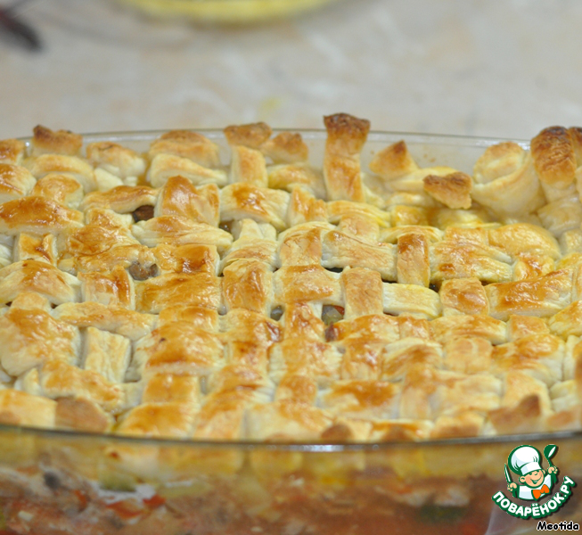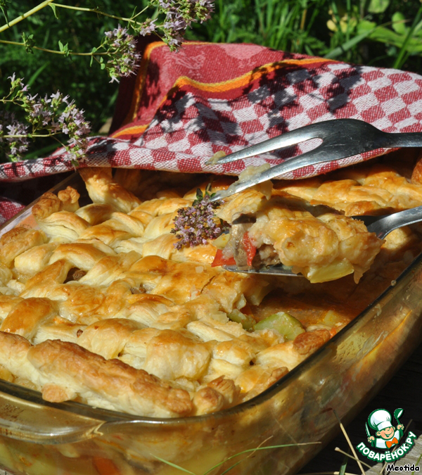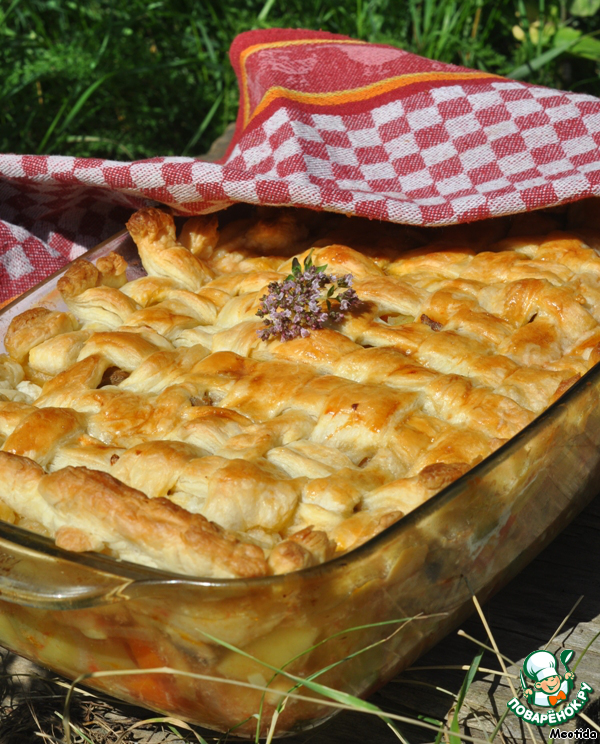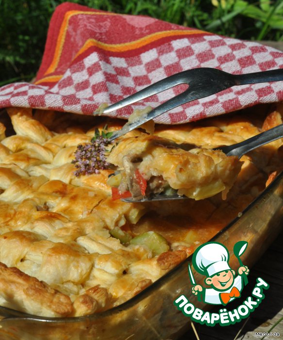 | Как просто из самых обычных ингредиентов сделать праздничное блюдо? Можно приготовить просто соус, жаркое.. это блюдо можно называть как угодно.. сути это не изменит - нужно только взять любые овощи, которые окажутся у Вас под рукой.. все смешать, залить водой и немного потушить. Если нужно накормить мужчин, то без маленького кусочка мяса не обойтись... Ну, а если Вы хотите приготовить нарядное.. праздничное блюдо, то можно взять кусочек теста и украсить соус, превратив его в праздничный пирог. |