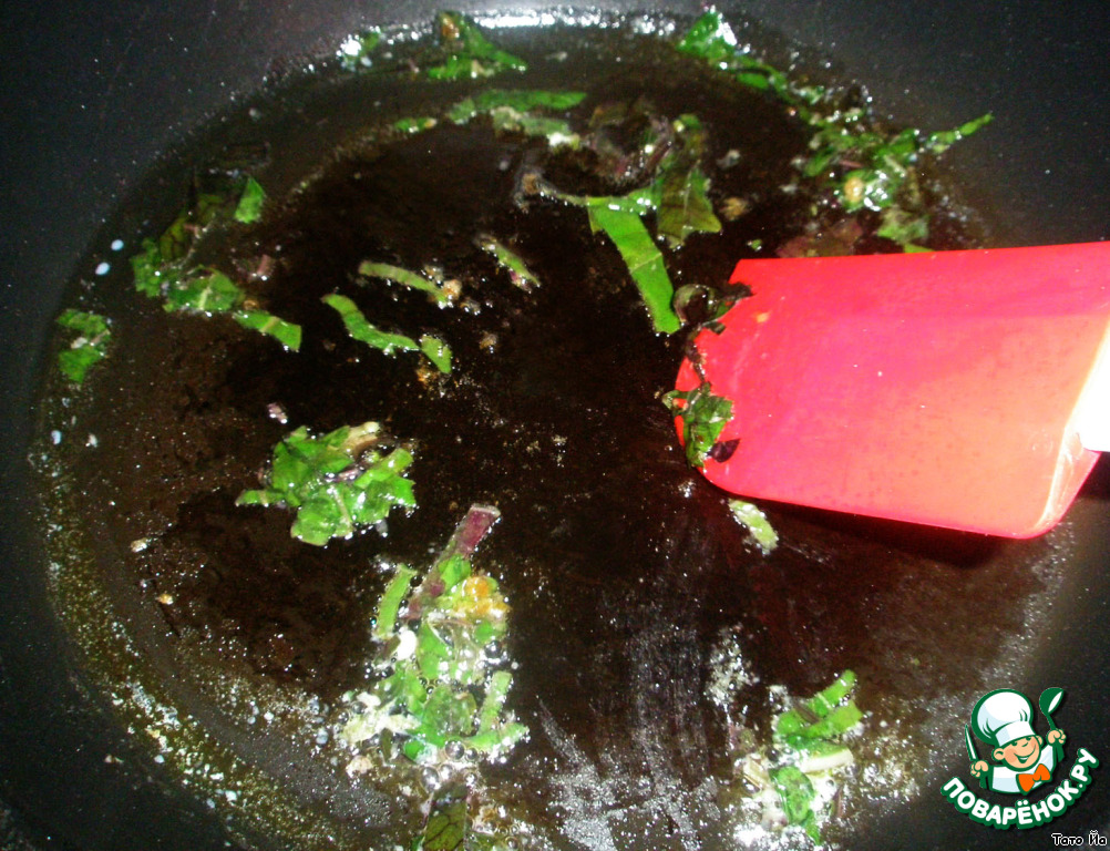 В сковороде растопим сливочное масло и добавим туда базилик, подержим пару минут на маленьком огне.
