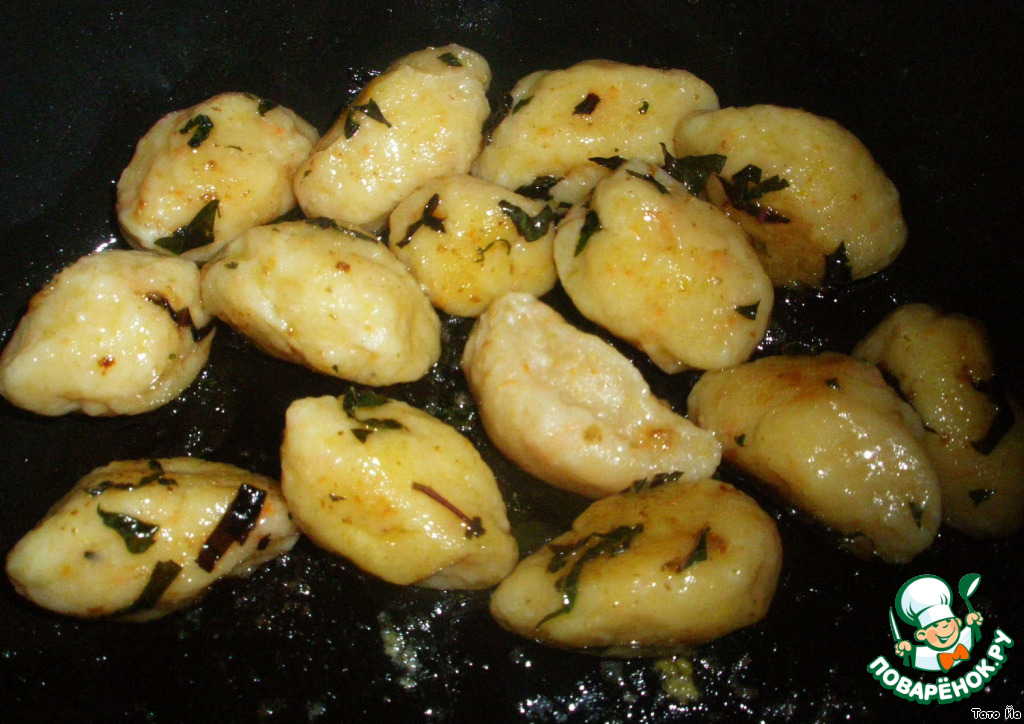 Сваренные ньокки добавляем к маслу на сковороду и греем несколько минут.