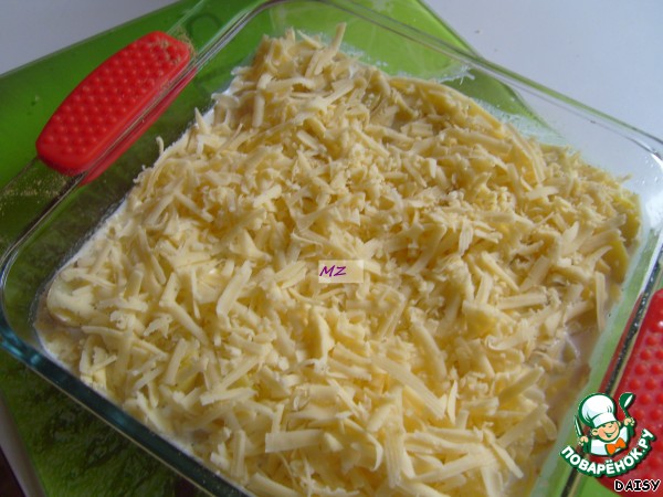 Посыпаем тертым сыром и ставим в духовку на 1 час - температура 200 градусов.