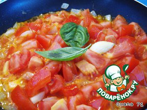 Чистим зубчик чеснока и кладём его целым в помидоры. Солим, добавляем тёртый мускатный орех, листик базилика.