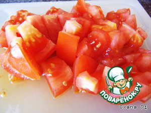 Моем помидоры и режем их кубиками, добавляем к луку.