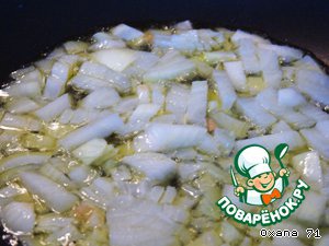 Режем мелко лук, обжариваем на растительном масле ( лучше, конечно, на оливковом! ) до золотистого цвета.