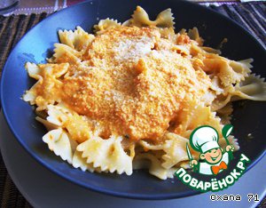 Фарфалли смешиваем с соусом, посыпаем сверху тёртым сыром "Пармезан".