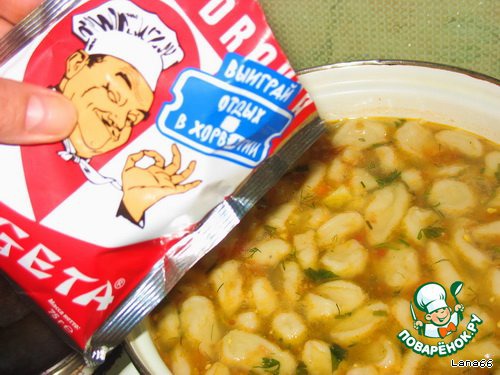 Добавляем по вкусу Вегету. Накрываем крышкой и убираем с огня. Даем немного супу постоять.