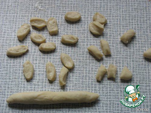 Из теста скатать жгутик толщиной с мизинец и тонко нарезать галушки.