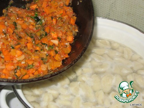 А тем временем наши галушки и тефтельки сварились. Заправляем поджаркой.