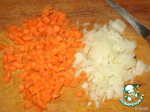 Пока в кастрюле варятся тефтельки с галушками и картофель, делаем заготовку для поджарки. Для этого нарезаем мелко морковь (кубиком) и лук.