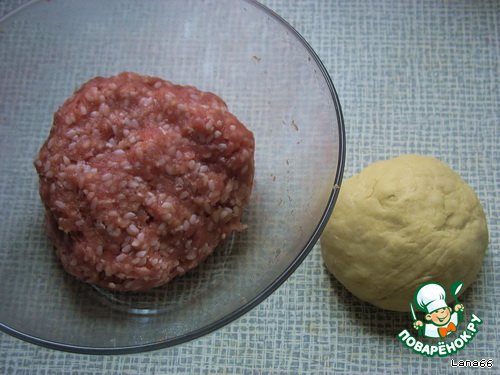 Мясо прокрутить через мясорубку, добавить соли и риса. В миску разбить яйцо, вылить скорлупки воды, добавить соль и муку. Муку использовать столько, пока тесто не станет прилипать к рукам. Замесить и оставить под пленкой.