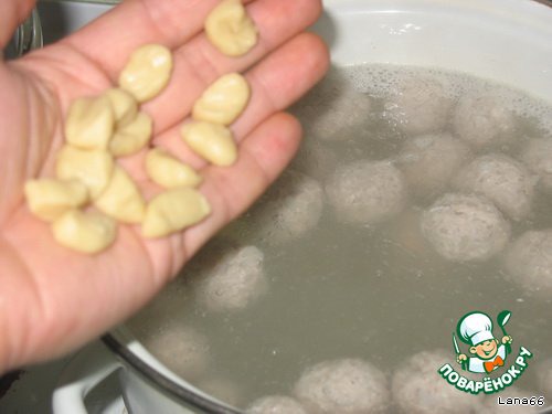 Как только вода закипела и тефтельки всплыли, кладем галушки. Обязательно при этом помешиваем, чтобы галушки не прилипли ко дну кастрюли.