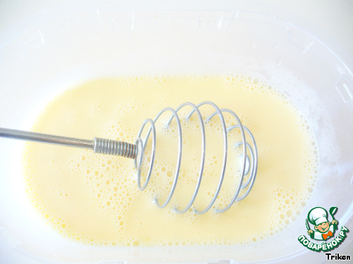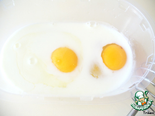Отмеряем ингридиенты. В миску разбиваем яйца, льем молоко.