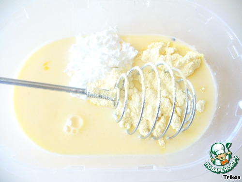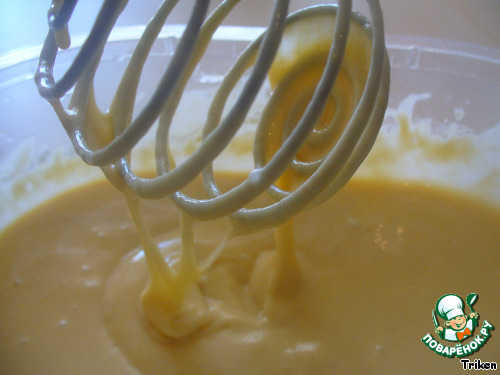 Вымешиваем венчиком. Добавляем пшеничную муку и хорошо размешиваем до однородности. Получится тесто примерно как на кекс.