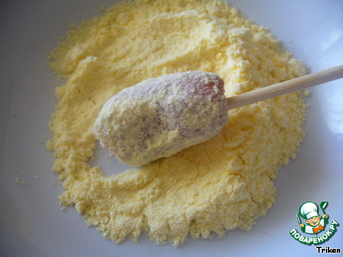 Даем тесту постоять 10 минут. В это время нанизываем сосиски на палочки, насыпаем кукурузную муку в тарелку и обваливаем в ней сосиски.