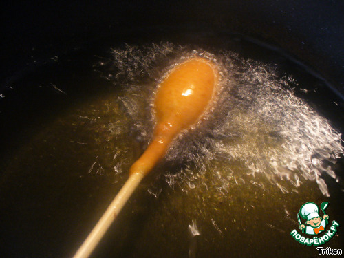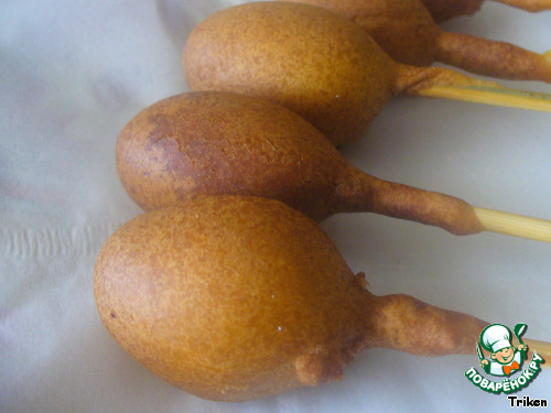 Погружайте сосиски по одной в разогретое растительное масло и быстро проворачивайте несколько раз вокруг своей оси. Внимание! Первые 20 секунд они обязательно должны полностью быть погружены в масло, иначе высунутая часть вспучится и ровной формы уже не получится. Далее можно отложить их и жарить как на фото, время от времени переворачивая. На то, чтобы один корн-дог приготовился, необходимо минута-полторы.