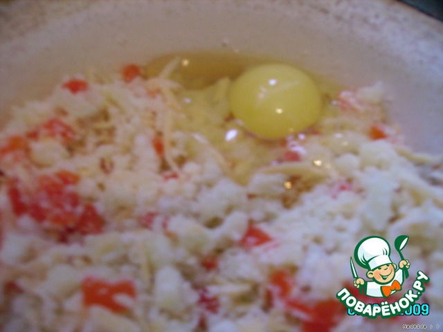 Картофельную массу смешать с яйцами, мукой, манкой, перцем и сыром.