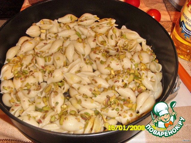 Форму смазать маслом, положить ракушки, обсыпать фисташками