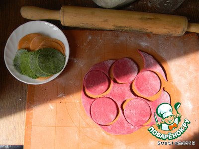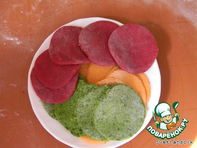 В 3-х разных емкостях замесить тесто из свекольного, морковного сока, измельченного шпината и муки. Раскатать тесто и вырезать круги стаканом.