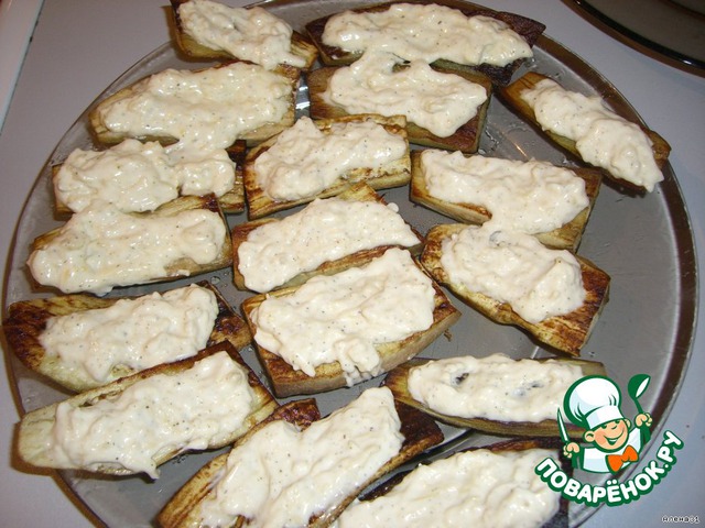 Уложить баклажаны на тарелочку и на немного остывшие баклажаны, укладывать готовый соус.