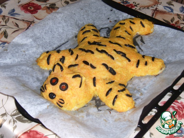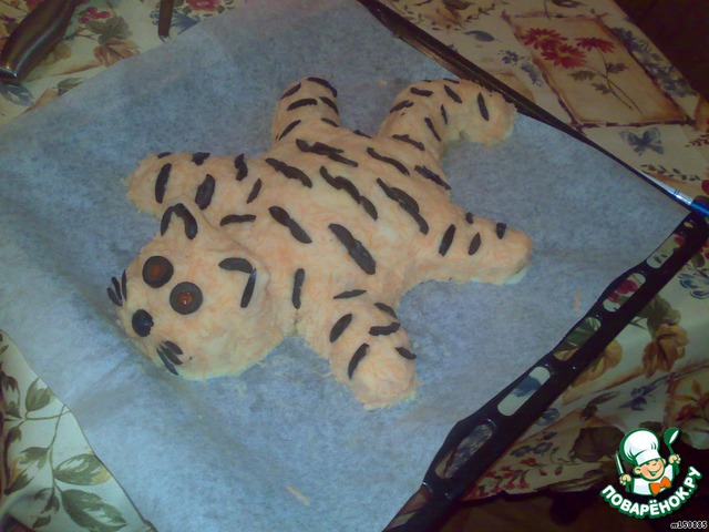 Из маслин делаем ему глазки, полоски и усики и отправляем запекаться на 160-170 градусов в духовку на 30-40 минут. Следим чтобы «шубка» нашего тигренка не зарумянилась.