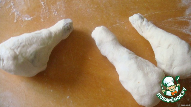 Разрежьте тесто на 3 части и плотно заверните готовые окорочка,хорошенько прижать.