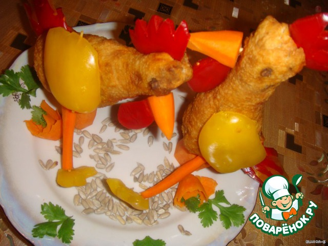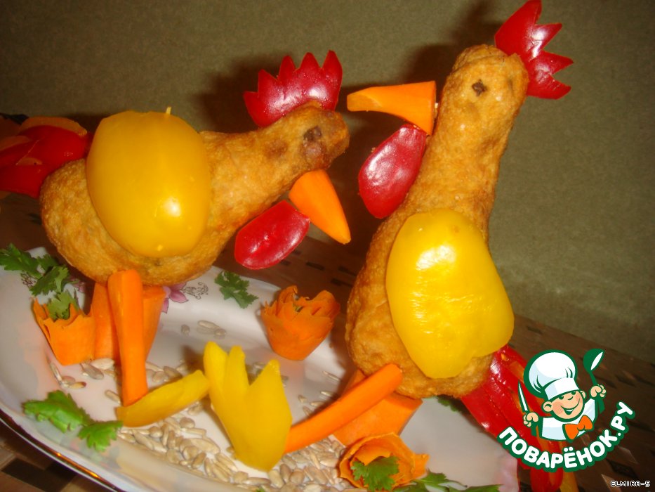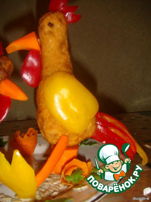 Вырезаем из перца "лапы,гребешок,крылья,бородку,хвостик"из моркови"ножки и клюв".Скрепляем при помощи зубочисток.Делаем "глазки"из гвоздики
