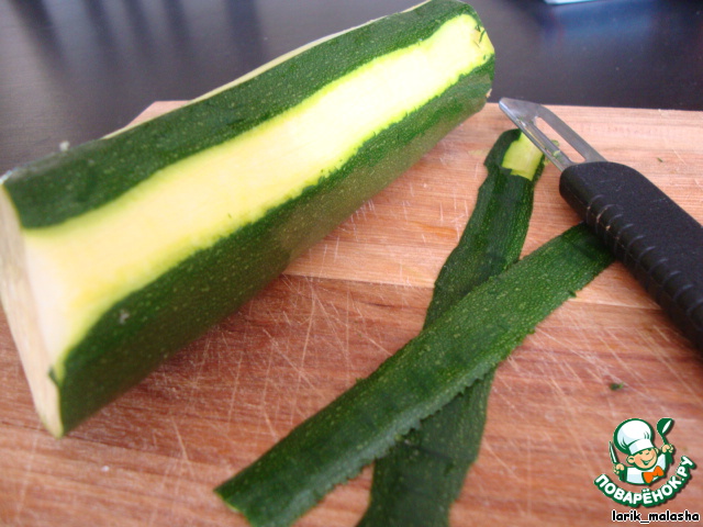 Кабачки почистить аккуратно ножом или овощечисткой; сделать 12 длинных "ленточек", они нам понадобятся для украшения.