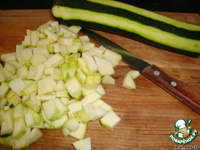 Кабачки нарезать мелкими кубиками. Сварить в кипящей воде около 10 минут. Слить воду, немного отжать.