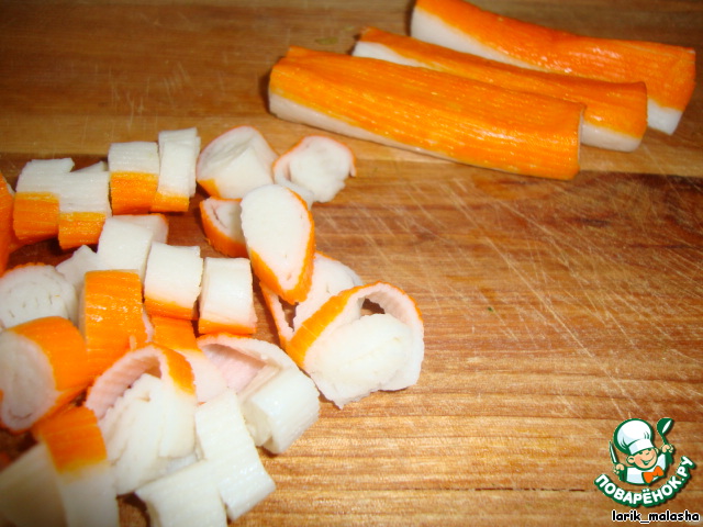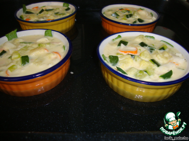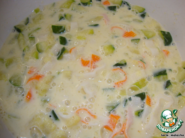 Сливки немного взбить с яйцами, добавить крахмал, соль и перец. Затем добавить к этой смеси кабачки и крабовые палочки. Перемешать.