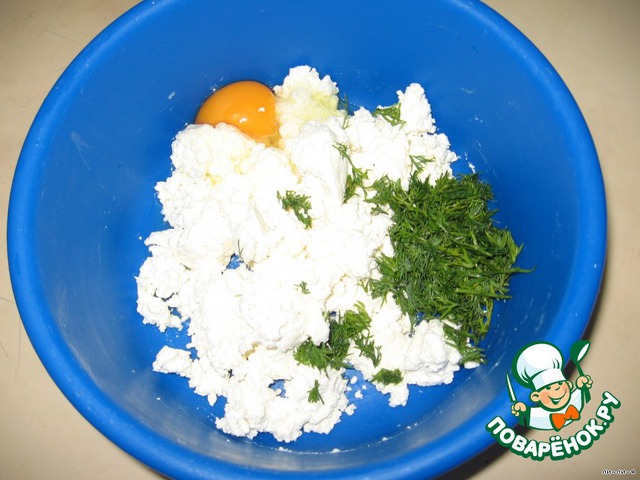Смешиваем в миске творог (у меня 5%), яйцо и