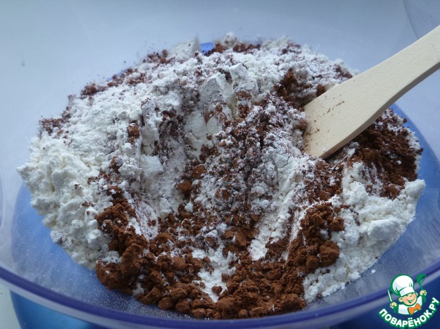 Муку перемешать с какао (какао используйте хорошего качества, для приготовления десертов и напитков, я использовала "Россия - щедрая душа")