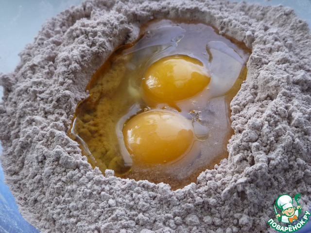 Разбить яйца, влить оливковое масло, воду и замесить тесто (если будет рассыпаться, добавить еще немного воды).