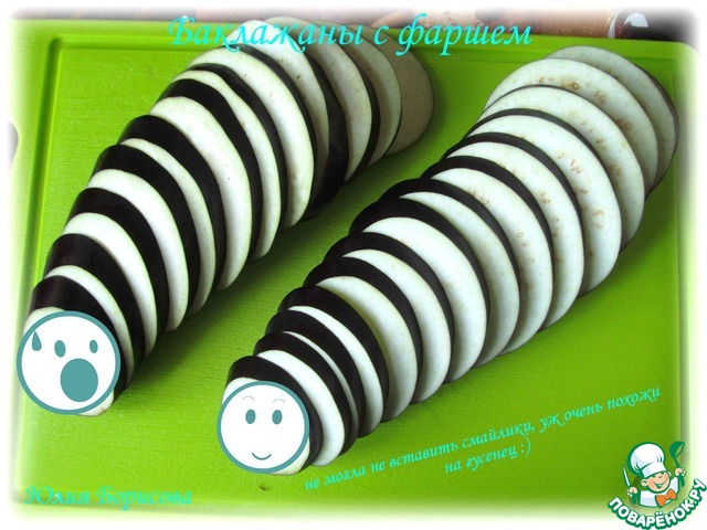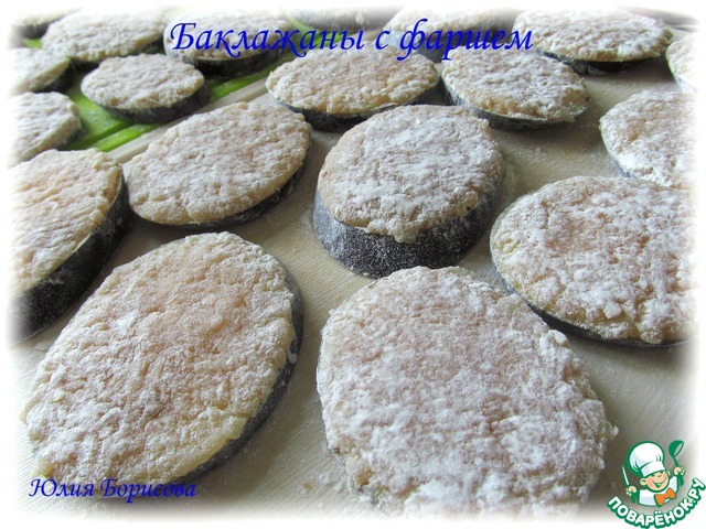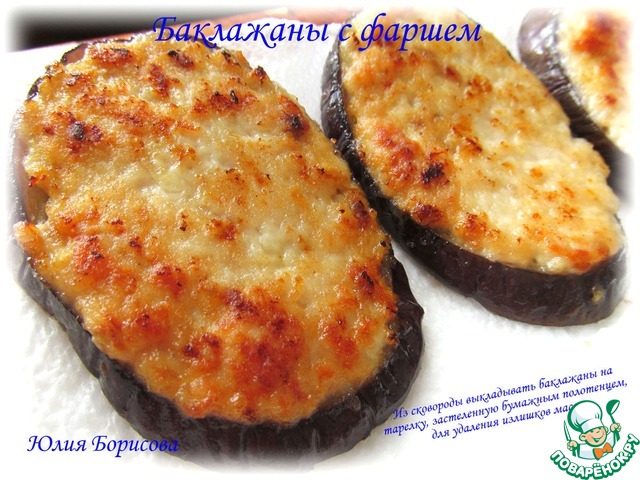 Главное, НЕ СОЛИТЬ кусочки баклажана, иначе они пустят сок, и тогда фарш может отставать от баклажана при жарке - без соли всё прекрасно держится.