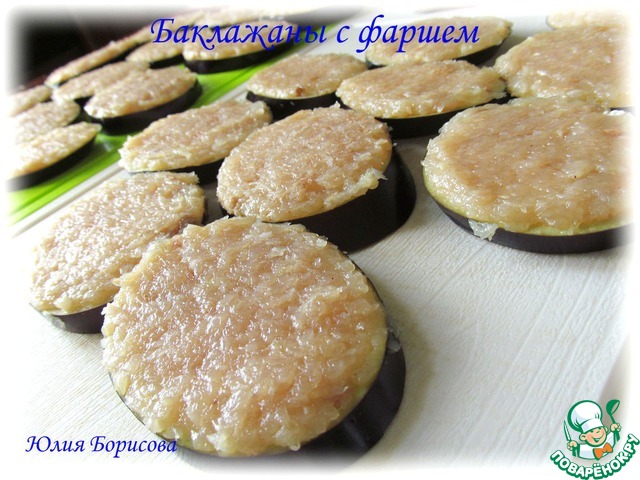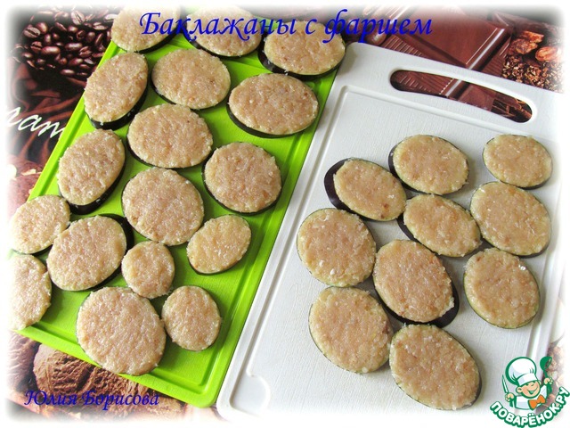 Намазать фарш на каждый кусочек баклажана (я намазывала чайной ложкой).