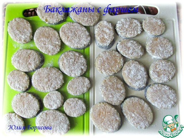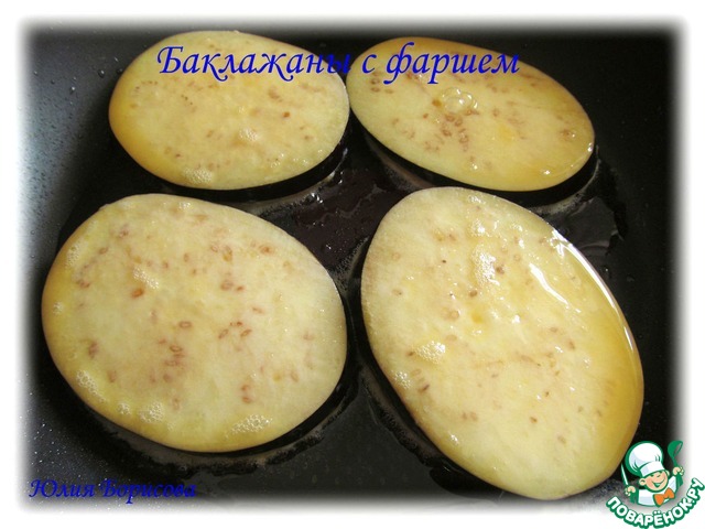 Обвалять баклажаны с фаршем в муке, затем во взбитом посоленном яйце и жарить в разогретом растительном масле сначала фаршем вниз на небольшом огне с двух сторон до готовности.