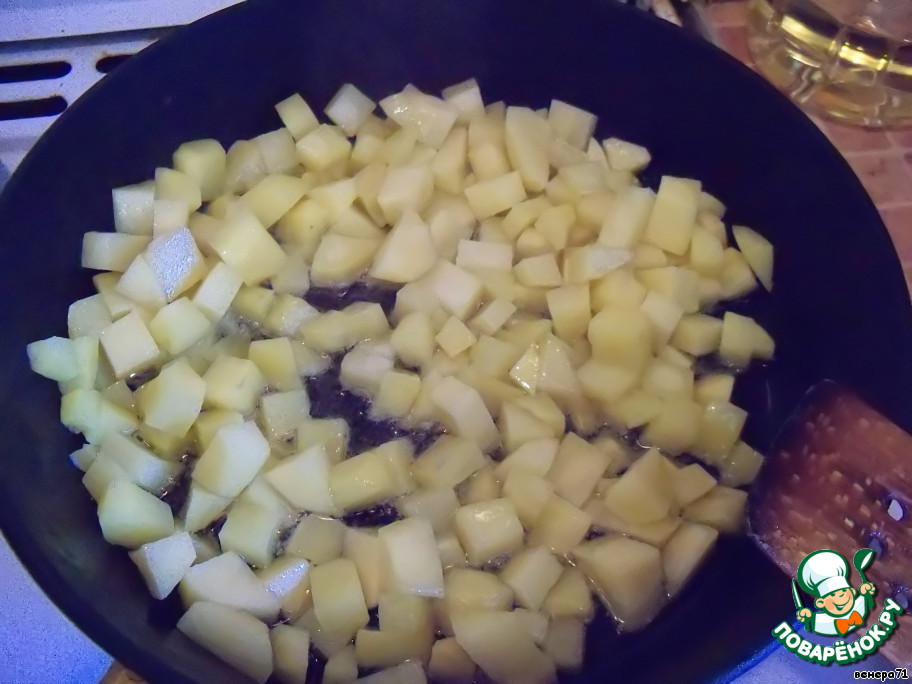 Картофель почистить, нарезать небольшими кубиками и немного обжарить на растительном масле, посолить.