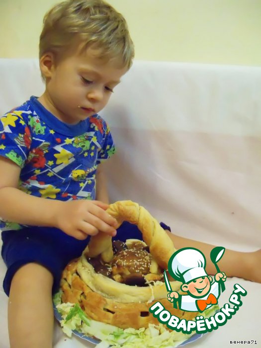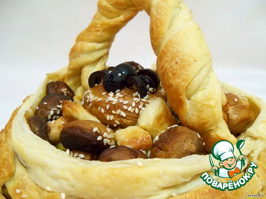 Пока запекается фарш, сплести из слоеного теста корзинку.