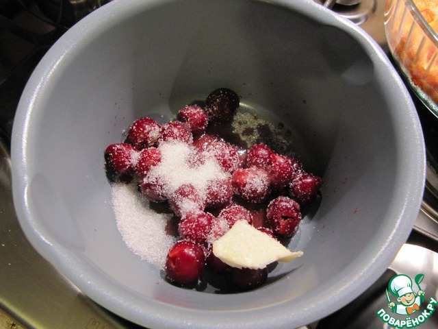 Готовим соус: вишню засыпаю сахаром, кладу кусочек масла и варю несколько минут. Пропорции не привожу, так как все сделала на глазок, количество сахара зависит от кислоты вишен, пробуйте на свой вкус!