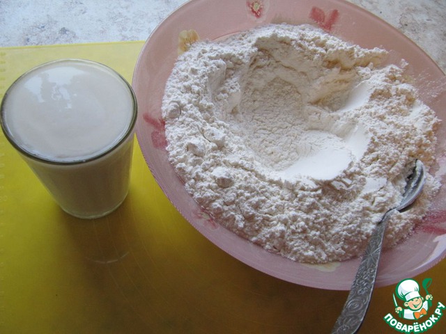 В муку вылить кефир, вбить яйцо, щепотку соли, неполную чайную ложку соды. Перемешать.