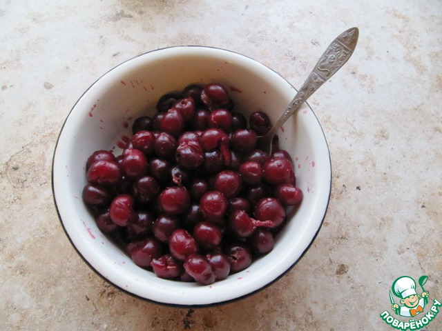 Тем временем вымытую вишню очистить от косточек любым способом (у меня древний - шпилька).