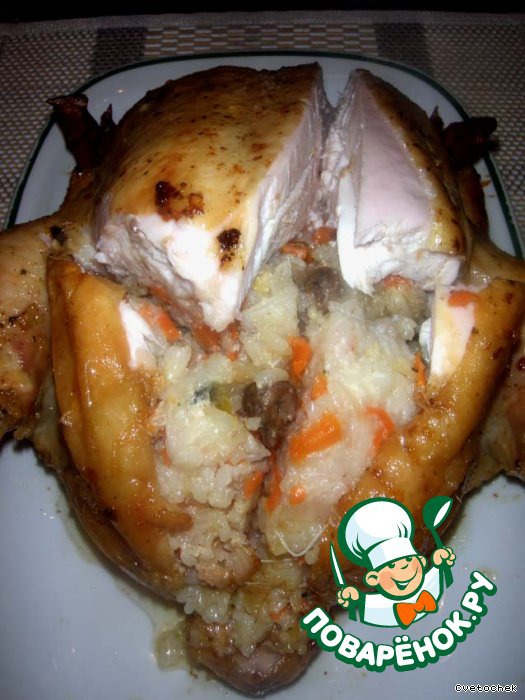 Отдохнувшую курочку начиняем получившейся смесью и зашиваем (моя подруга даже не зашивает, но я для собственного спокойствия это сделала).