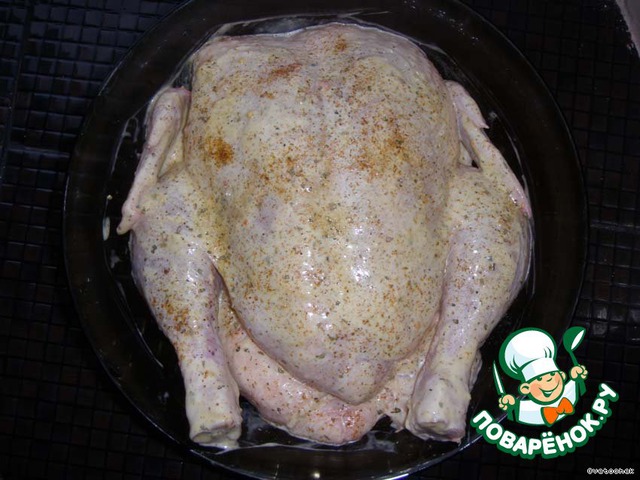 Натираем данной смесью предварительно вымытую и обсушенную куриную тушку как снаружи, так и изнутри. После таких SPA-процедур курочка должна отдохнуть в среднем пару часов.