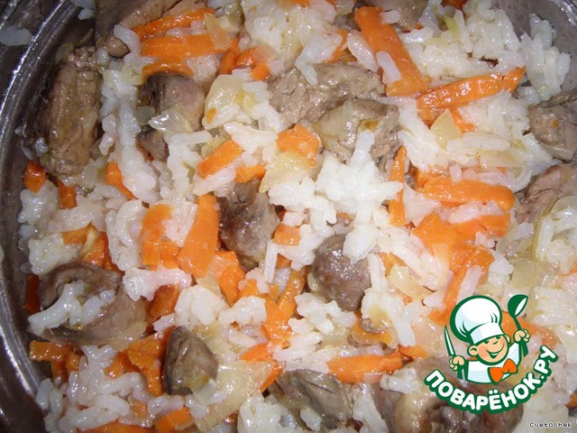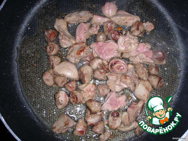 Сердца куриные подготавливаем и также отправляем на раскалённую сковороду. Через 5 минут добавляем нарезанную печень.