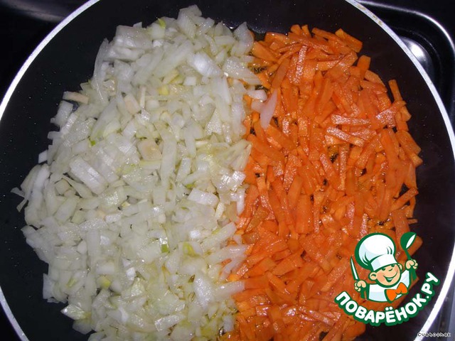 Немного припустив, отправляем к ней измельченный лучок. Обжариваем до золотистости.
